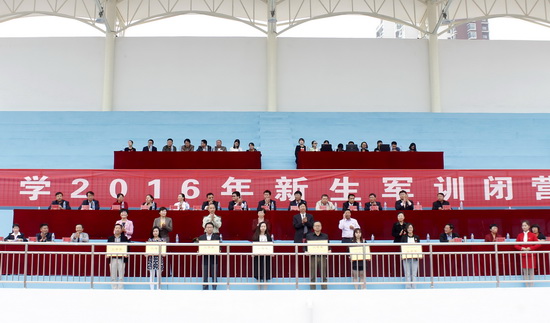本站訊9月30日上午,我校2016級新生軍訓閉營式在田徑運動場舉行。校領導張新梅、宋志敏、萬是明、趙輝、范金梅、何世玲、李新春、成芳、李治、承訓部隊首長出席了閉營式,校軍訓工作領導小組成員、各院(部)領導及5000余名新生參加了閉營式,儀式由校工會主席成芳主持。