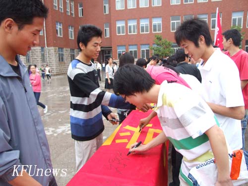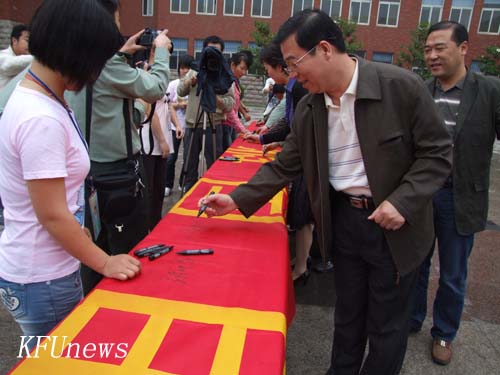 本站訊 5月21日下午,我校舉行2010年“獻身國防,接受祖國挑選”簽名活動。開封市軍分區(qū)參謀長張中華、金明區(qū)武裝部部長夏憲勇、政委胡俊偉、開封市軍分區(qū)參謀馬明,我校校領(lǐng)導儲建新、趙輝、范金梅,宣傳部、學工部、教務處、團委、保衛(wèi)處、就業(yè)指導中心等部門負責人,以及2010屆應屆畢業(yè)生近千人參加了簽名活動。簽名活動由副校長萬是明主持,校長拜五四和張中華發(fā)表熱情洋溢的講話并在活動現(xiàn)場簽名。