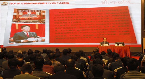 何白鷗書記圍繞省十次黨代會(huì)精神和省委書記謝伏瞻所作的工作報(bào)告,從深刻認(rèn)識(shí)學(xué)習(xí)宣傳貫徹省十次黨代會(huì)精神的重大意義、全面準(zhǔn)確把握省十次黨代會(huì)精神實(shí)質(zhì)、切實(shí)把學(xué)習(xí)宣傳貫徹省十次黨代會(huì)精神引向深入三個(gè)方面,對(duì)省十次黨代會(huì)精神進(jìn)行了全面解讀,作了一場(chǎng)精彩的輔導(dǎo)報(bào)告。他說,學(xué)習(xí)貫徹省十次黨代會(huì)精神,首先在學(xué)。省十次黨代會(huì)精神主要體現(xiàn)在謝伏瞻同志代表九屆省委所作的報(bào)告中。要通讀、精讀、重點(diǎn)讀,深刻理解、準(zhǔn)確把握?qǐng)?bào)告提出的鮮明主題、總體要求和基本原則、主要目標(biāo)、主要任務(wù)和重大舉措,切實(shí)增強(qiáng)責(zé)任感、使命感、緊迫感,以實(shí)際行動(dòng)推動(dòng)省十次黨代會(huì)各項(xiàng)任務(wù)部署落地生根。黨員領(lǐng)導(dǎo)干部要發(fā)揮以上率下、示范引領(lǐng)的“關(guān)鍵少數(shù)”作用。帶著問題學(xué),緊密聯(lián)系實(shí)際、突出問題導(dǎo)向,增強(qiáng)學(xué)習(xí)的針對(duì)性。學(xué)習(xí)貫徹省十次黨代會(huì)精神,關(guān)鍵在做。省十次黨代會(huì)確定的奮斗目標(biāo),是擺在我們黨員干部面前光榮而艱巨的任務(wù)。要立足自身實(shí)際、突出問題導(dǎo)向,找準(zhǔn)工作推進(jìn)的重點(diǎn)難點(diǎn),把力量凝聚到實(shí)現(xiàn)大會(huì)確定的各項(xiàng)任務(wù)上來。要切實(shí)增強(qiáng)大局意識(shí)和責(zé)任意識(shí),把學(xué)習(xí)宣傳貫徹省十次黨代會(huì)精神與“兩學(xué)一做”學(xué)習(xí)教育結(jié)合起來,與做好當(dāng)前各項(xiàng)工作結(jié)合起來,形成決勝全面小康、讓中原更加出彩的精神力量。