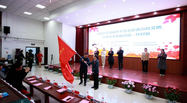 李寧副所長(zhǎng)借助此次活動(dòng)的契機(jī),動(dòng)員青年學(xué)生積極加入到全省百千萬(wàn)志愿者防艾的隊(duì)伍中,為新時(shí)代文明實(shí)踐和艾滋病防治工作貢獻(xiàn)青年力量。隨后,開(kāi)封市疾控中心黨委副書記、副主任梁建立向駐馬店市疾控中心艾滋病防治科科長(zhǎng)龔濤傳遞了河南省疾控中心“百千萬(wàn)艾滋病宣傳志愿服務(wù)隊(duì)”隊(duì)旗。