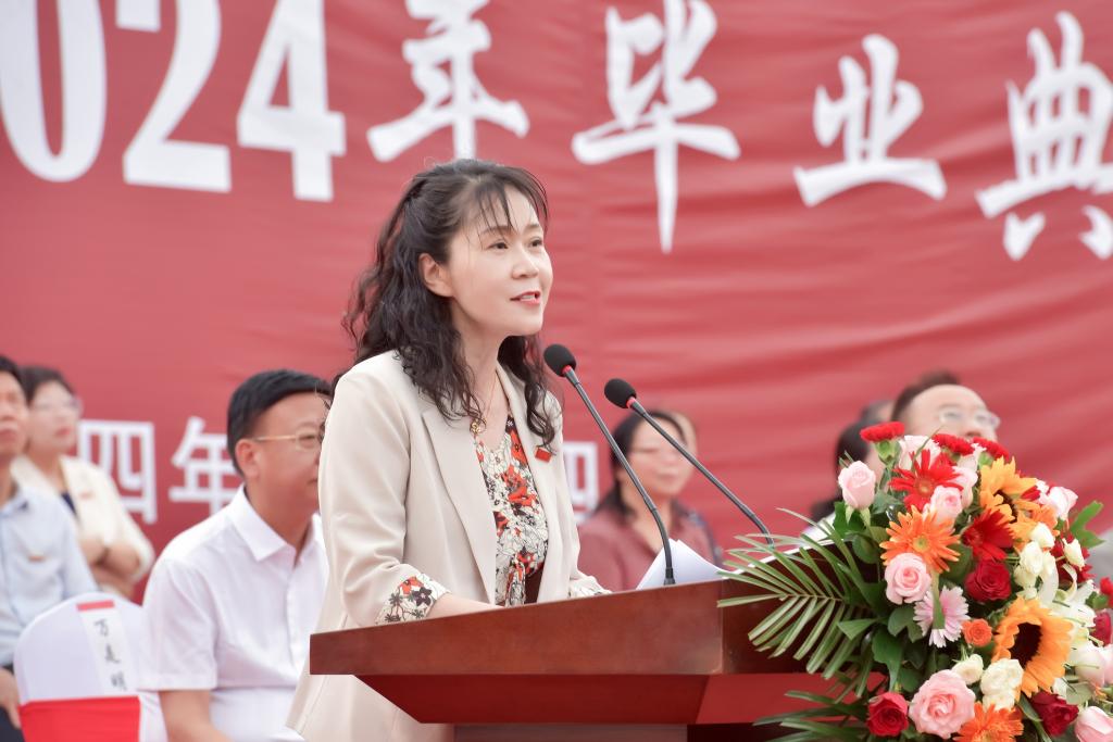 校長王德如代表學校向2024屆畢業生致以最熱烈的祝賀,他總結了近年來學校在教育、科研以及社會服務等方面的發展與突破。在即將各奔東西的時刻,王德如對2024屆畢業生寄予了三點深切期望:一是順應大勢,成就大我。號召同學們要堅定不移聽黨話,跟黨走,把小我融入大我,努力書寫愛黨愛國、砥礪奮斗的新篇章。二是堅定務實,創造未來。鼓勵同學們發揚務實精神,把心思和精力用在干事創業上,高質量完成每一項工作任務,在平凡的工作中積蓄能量,讓青春之花盛開得更加嬌艷。三是堅韌不拔,勇攀高峰,期待同學們保持只爭朝夕、奮發有為的姿態和越是艱險越向前的精神,不斷超越自我,取得一個又一個人生巔峰。