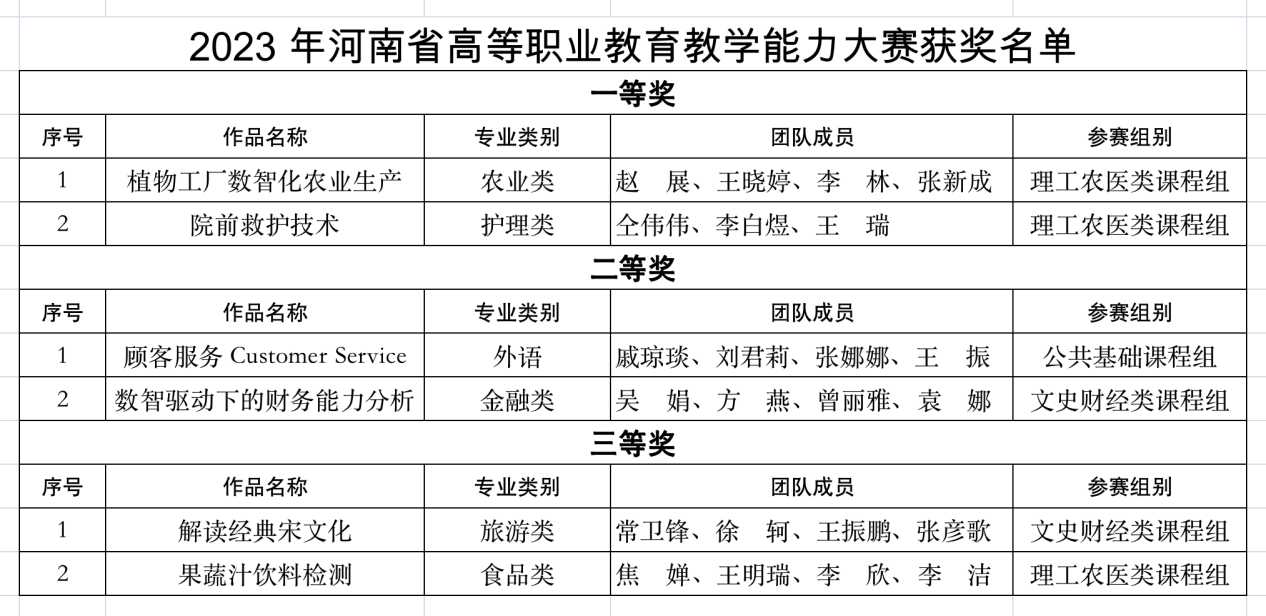 本站訊 近日,河南省教育廳公布了2023年河南省高等職業教育教學能力大賽獲獎名單(教職成〔2023〕268號),我校榮獲2個一等獎、2個二等獎、2個三等獎的優異成績。