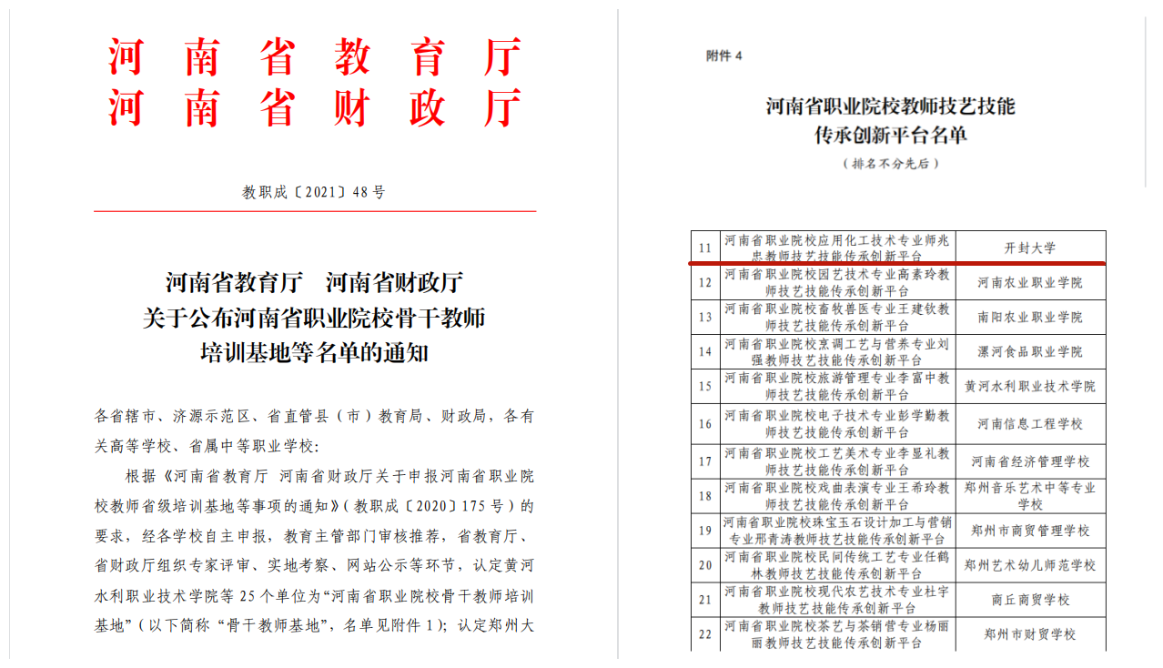 近日,河南省教育廳、財政廳組織開展了河南省職業院校教師技藝技能傳承創新平臺建設計劃評審活動。我校材料與化學工程學院院長師兆忠教授主持申報的“應用化工技術專業師兆忠教師技藝技能傳承創新平臺”脫穎而出,獲批職業教育技藝技能傳承創新平臺。