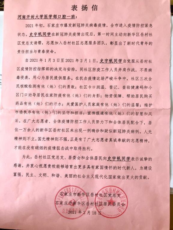 這封有愛、有溫度、又有著中國青年責(zé)任和擔(dān)當(dāng)?shù)母兄x信在學(xué)生群體中廣泛傳閱,許多熟悉史宇帆的老師和同學(xué)們都非常感動,這不僅僅是石家莊市新華區(qū)岳村社區(qū)居民委員會對志愿者們夜以繼日、加班加點工作的肯定,而且彰顯了青年一代在這場戰(zhàn)“疫”中不忘初心,砥礪前行的決心,更充分反映了醫(yī)學(xué)部“立德樹人”的成果。