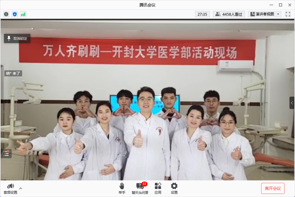 11月10日下午,由河南省老年口腔醫學繼續教育培訓中心主辦、省內多所本專科高校(口腔)醫學院(系)協辦的“萬人在線齊刷刷”活動第二期在“騰訊會議”召開。我校1名教師和8名學生組建了科普團隊,在醫學部口腔系馬惠萍、馬冬梅、楊玉紅、王艷莉、袁浩,口腔實訓中心李凱、宗盈盈等教師的指導下,經過四天的緊急演練,在線奉獻了精彩的口腔知識科普情景劇。